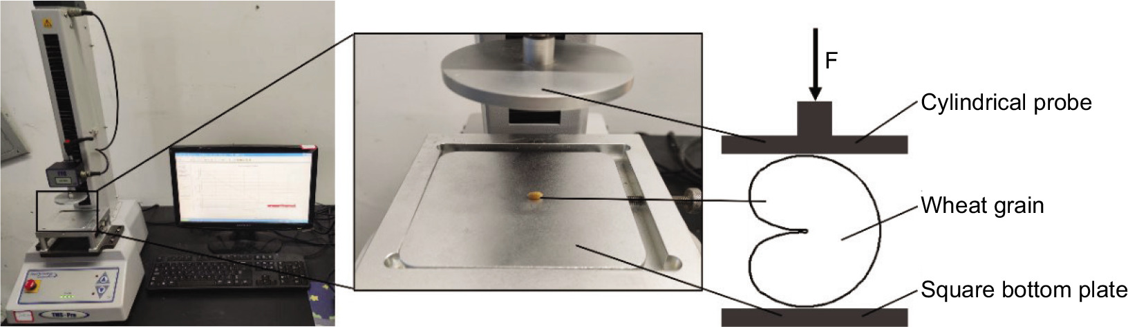 Globally, wheat is one of the most important food crops, and it has been extensively cultivated and consumed worldwide. At present, integrity of wheat grains is regarded as an important indicator to evaluate wheat quality both nationally and internationally. Sowing, harvesting, storage, and processing of wheat are becoming increasingly mechanized with rapid development of modern mechanical manufacturing industry. Wheat grains will suffer various external mechanical forces during sowing, harvesting, storage, and processing of wheat, which can result in deformation or even fracture of grains. The failure grains can be easily invaded by microorganisms, which can shorten the storage life of grains and reduce the processing quality and food safety of wheat (Chen and Li, 2024; Fu et al., 2018). Therefore, studying mechanical properties of wheat grains under different moisture content is of great significance to optimize parameters of the processing equipment and improve utilization value of wheat grains (Ponce-García et al., 2016; Wang et al., 2023).