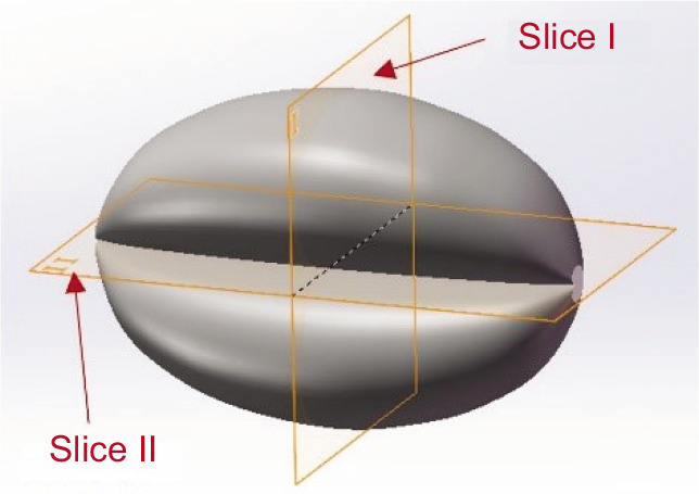Based on the mechanical compression tests of wheat grains, formation and propagation of external cracks inside the wheat grains compressed under different loads at different compression directions were observed by ultra-depth three-dimensional microscope system (UDM, Keyence VHX-5000). The compressed wheat grains were sliced, and then the internal microstructure and crack distribution of wheat grains were observed by Phenom XL desktop scanning electron microscope. The slice direction of compressed wheat grains is shown in Figure 3, and slice I is at the semi-minor axis of wheat grains while slice II is at semi-major axis of wheat grains.