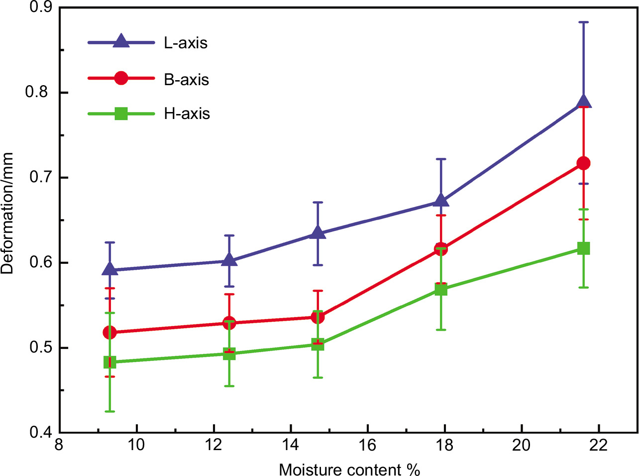 Figure 4. Changes in the deformation of wheat grain in compression fracture for different moisture content (9.3% ± 0.14%, 12.4% ± 0.05%, 14.7% ± 0.10%, 17.9% ± 0.17%, 21.6% ± 0.31%). L-axis, B-axis, and H-axis are the compression of length, width, and height orientation, respectively. Results are expressed as mean ± standard deviation (n = 20).
