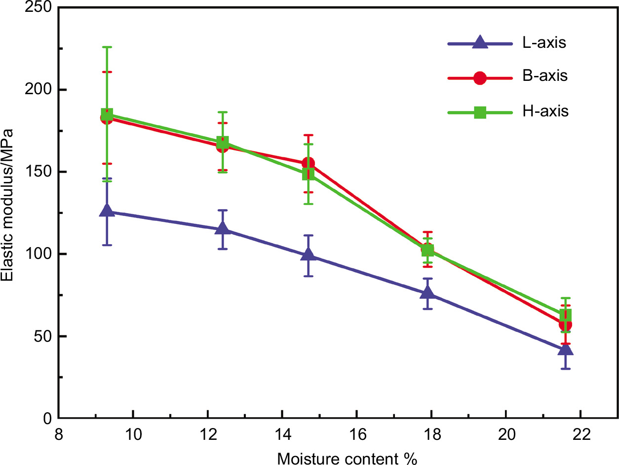 Figure 7. Changes in the elastic modulus of wheat grain in compression fracture for different moisture content (9.3% ± 0.14%, 12.4% ± 0.05%, 14.7% ± 0.10%, 17.9% ± 0.17%, 21.6% ± 0.31%). L-axis, B-axis, and H-axis are the compression of length, width, and height orientation, respectively. Results are expressed as mean ± standard deviation (n = 20).