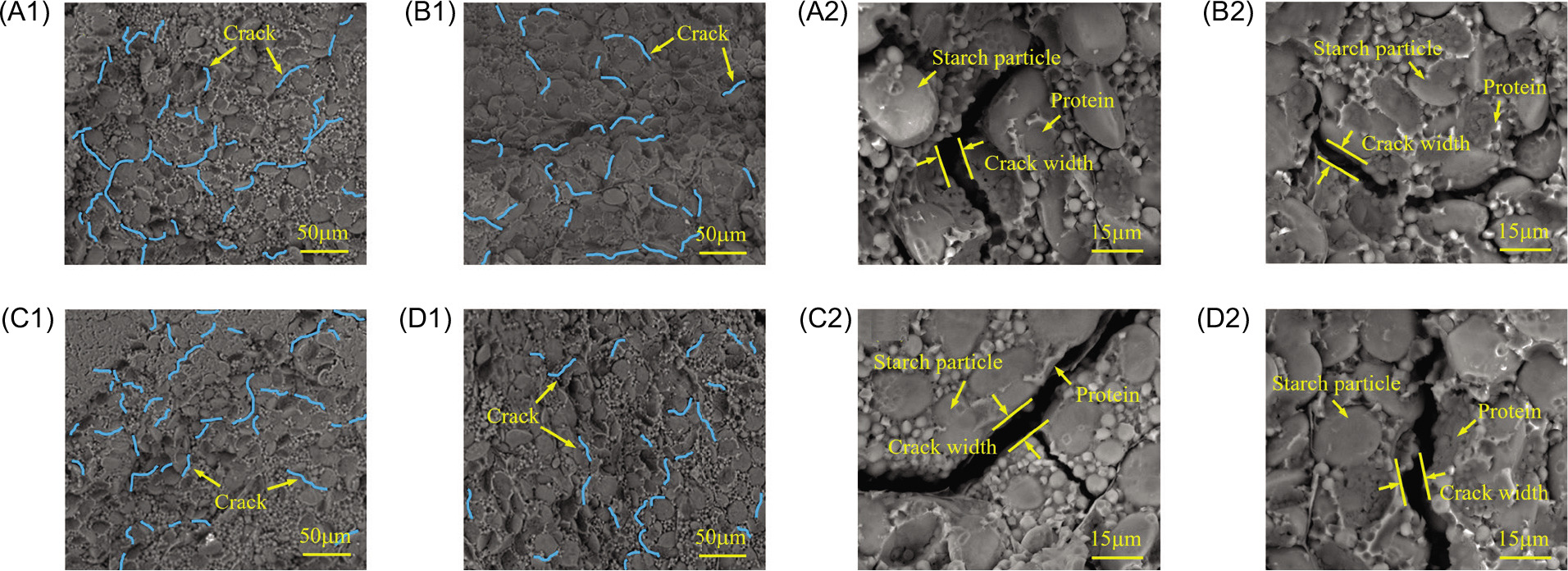 The gap size between starch particles of wheat grains with different moisture contents is also studied by comparing Figure 10(A2), Figure 10(B2) on slice I and Figure 10(C2), Figure 10(D2) on slice II. Results show that the gap between starch particles of wheat grains with lower moisture content is much larger, and protein attached to the surface of starch particles is much looser, indicating that the viscosity between starch particles is lower when moisture content of wheat grains is lower, and a very small deformation can lead to fracture of wheat grains during the compression test. While the gap between starch particles of wheat grains with higher moisture becomes smaller, wheat grains with high moisture content will absorb more moisture and swell, and protein attached to the surface of starch particles become much tighter, indicating that the viscosity between starch particles is higher when moisture content of wheat grains is higher and the ability to generate elastic deformation is much bigger; therefore, wheat grains with higher moisture content is hard to fracture during the compression process, which is consistent with the above experimental results in ‘Relationship between deformation and moisture content’ section.