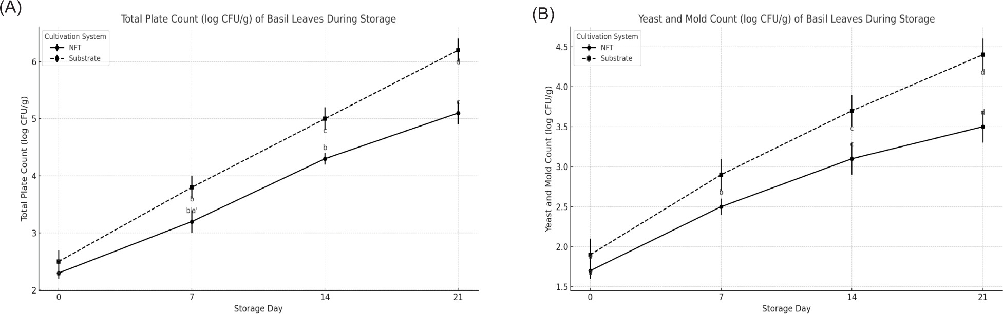 Microbial safety was evaluated by total plate counts (TPC) and yeast/mold populations. At harvest, both systems exhibited low and comparable microbial levels (~3.0 log CFU/g). Microbial counts increased progressively with storage time in both systems, but at lower rates in NFT basil.