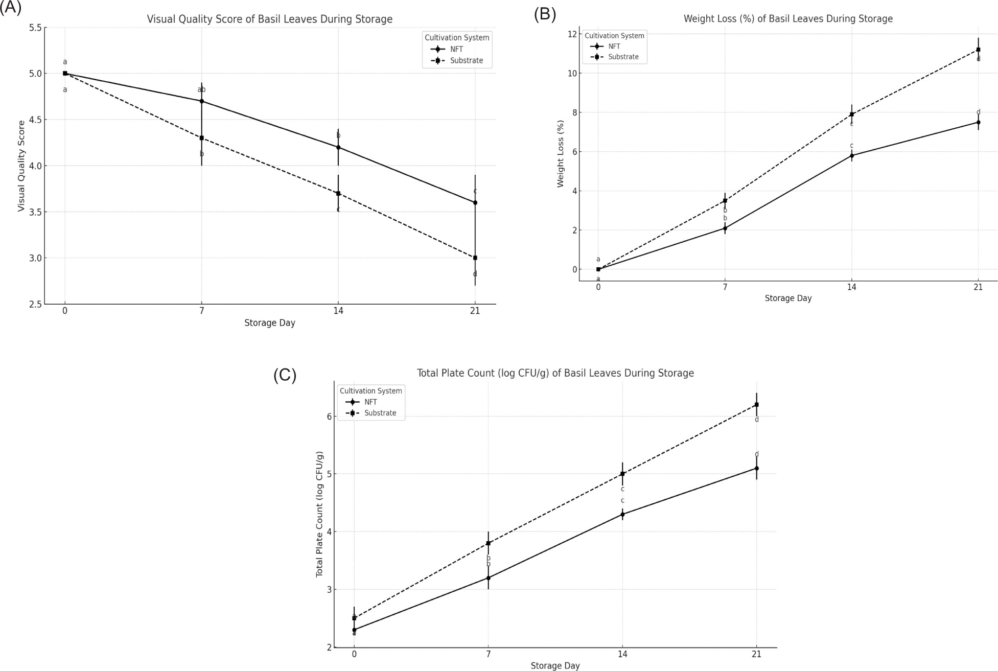 Off-odor development correlated with microbial proliferation. Mild off-odors were detected in both treatments at Day 14; however, by Day 21, strong spoilage odors were evident in substrate basil, whereas NFT basil showed only moderate sensory changes. Similarly, substrate leaves displayed more pronounced wilting and -yellowing, whereas NFT basil maintained better color and freshness.